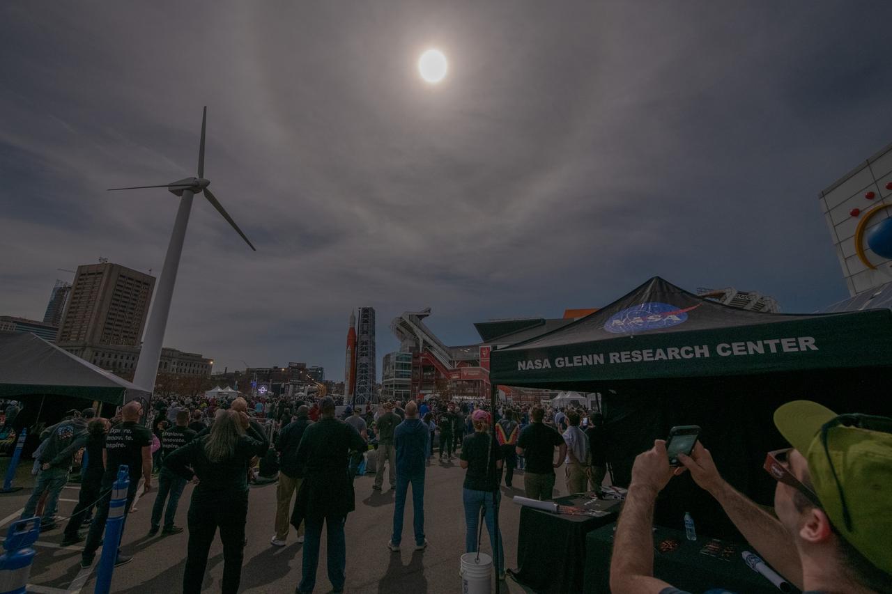 An event attendee views the eclipse on April 8, 2024. NASA Glenn Research Center and the Great Lakes Science Center hosted a three-day celestial celebration in downtown Cleveland, OH. This free, outdoor, family-friendly science and arts festival will feature free concerts, performances, speakers, and hands-on science activities with community partners. A total solar eclipse swept across a narrow portion of the North American continent from Mexico’s Pacific coast to the Atlantic coast of Newfoundland, Canada. A partial solar eclipse was visible across the entire North American continent along with parts of Central America and Europe.