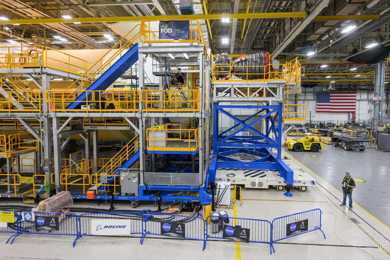 This image shows technicians and engineers move and connect the liquid oxygen tank (LOX) to the intertank as they continue the process of the forward join on the core stage of NASA’s Space Launch System rocket for Artemis II, the first crewed mission of NASA’s Artemis program at NASA’s Michoud Assembly Facility. The forward join connects the forward skirt, the liquid oxygen tank (LOX) and the intertank structures to form the top part of the SLS rocket’s core stage. Now, NASA and Boeing, the SLS prime contractor, will continue to integrate various systems inside the forward part of the core stage and prepare for structural joining of the liquid hydrogen tank and engine section to form the bottom of the stage. Together with its four RS-25 engines, the rocket’s massive 212-foot-tall core stage — the largest stage NASA has ever built — and its twin solid rocket boosters will produce 8.8 million pounds of thrust to send NASA’s Orion spacecraft, astronauts and supplies beyond Earth’s orbit to the Moon and, ultimately, Mars. Offering more payload mass, volume capability and energy to speed missions through space, the SLS rocket, along with NASA’s Gateway in lunar orbit, the Human Landing System, and Orion spacecraft, is part of NASA’s backbone for deep space exploration and the Artemis lunar program. No other rocket is capable of carrying astronauts in Orion around the Moon in a single mission.