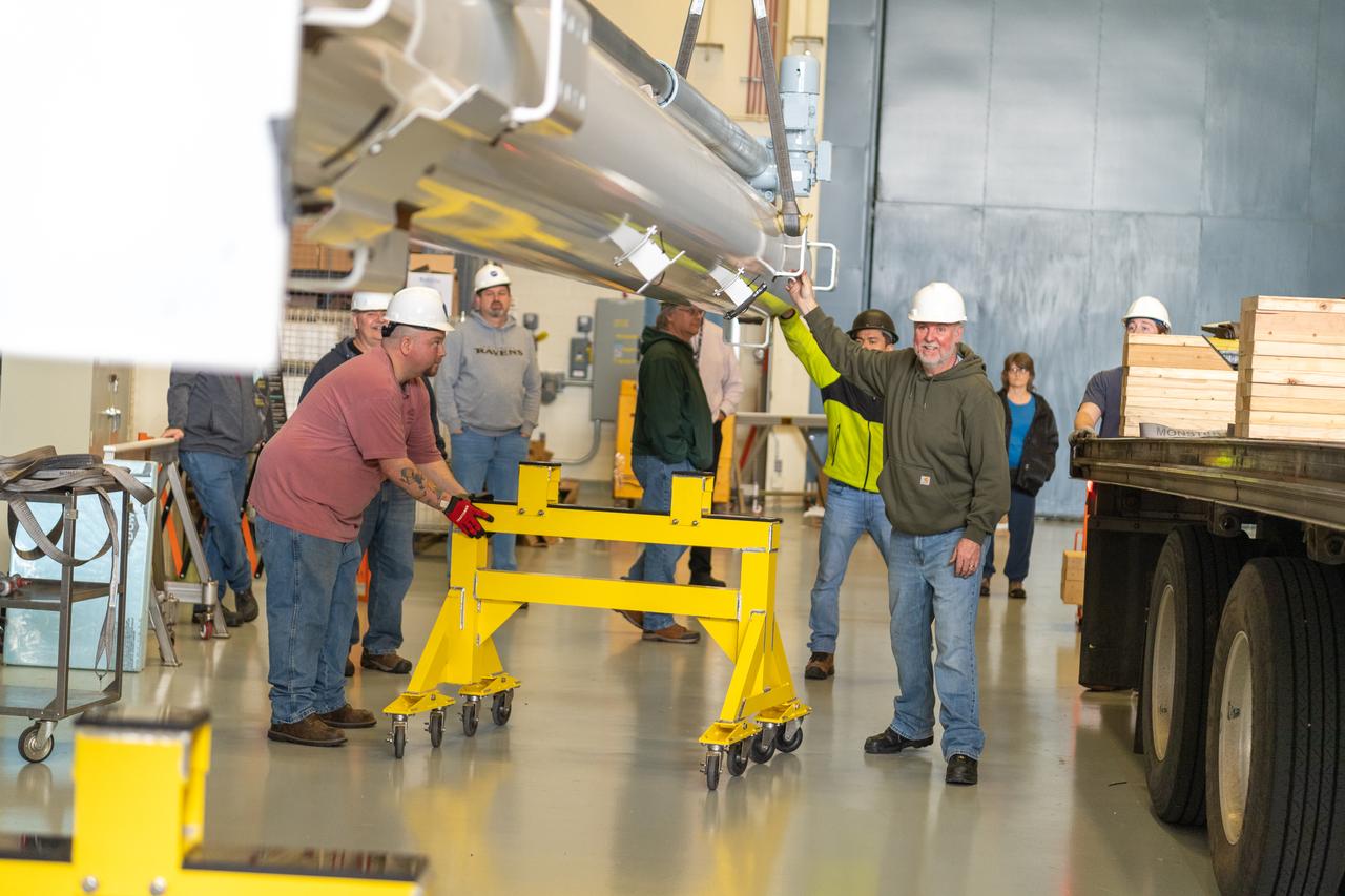 Mechanical engineering and integration technician Ivan Pratt installs brackets onto the static load testing platform in preparation of an OSAM-1 ground support equipment proof test at Goddard Space Flight Center, Greenbelt Md., July 19, 2023. This photo has been reviewed by OSAM1 project management and the Export Control Office and is released for public view. NASA/Mike Guinto