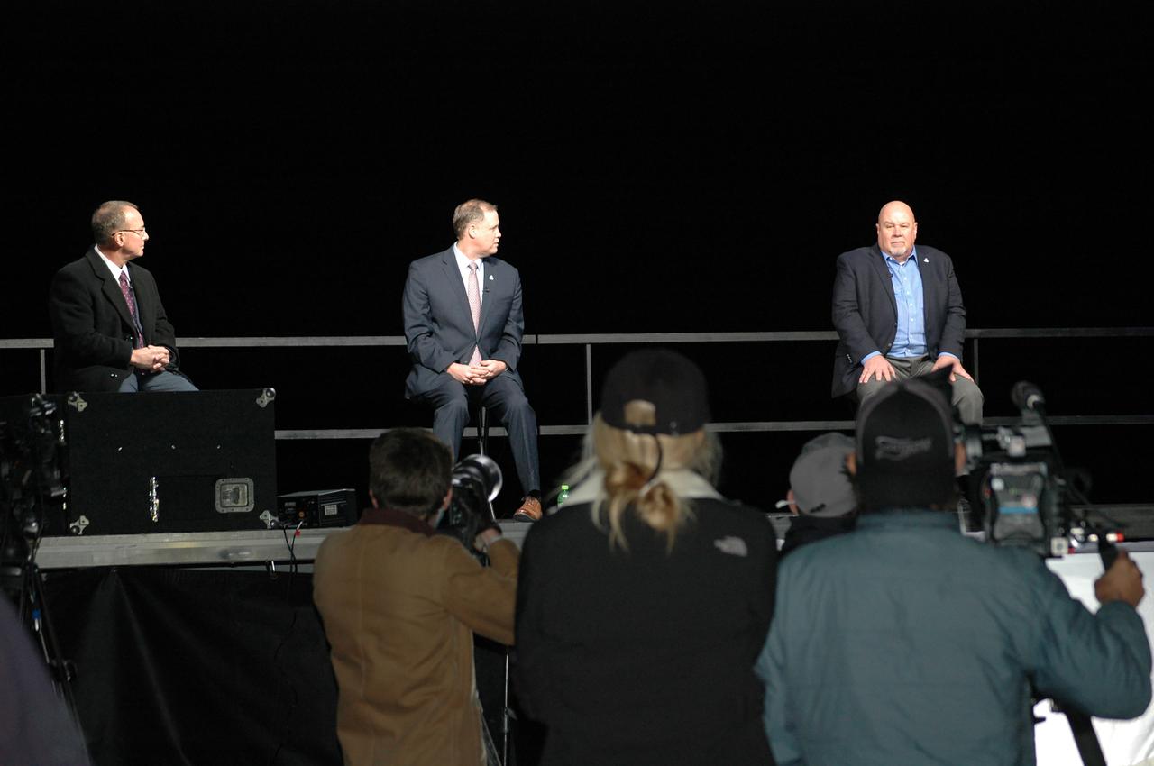 Outgoing NASA Administrator Jim Bridenstine (right), as Stennis Director Rick Gilbrech looks on, speaks to guests following the Green Run hot fire test of the core stage for NASA’s Space Launch System (SLS) rocket at Stennis Space Center near Bay St. Louis, Mississippi, on Saturday, January 16, 2021. NASA conducted a hot fire test of the core stage’s four RS-25 engines on the B-2 Test Stand at Stennis. Scheduled for as long as eight minutes, the engines fired for a little more than one minute to generate a combined 1.6 million pounds of thrust, just as will occur during an actual launch. The hot fire is the final test of the Green Run test series, a comprehensive assessment of the SLS core stage prior to launching the Artemis I mission to the Moon.