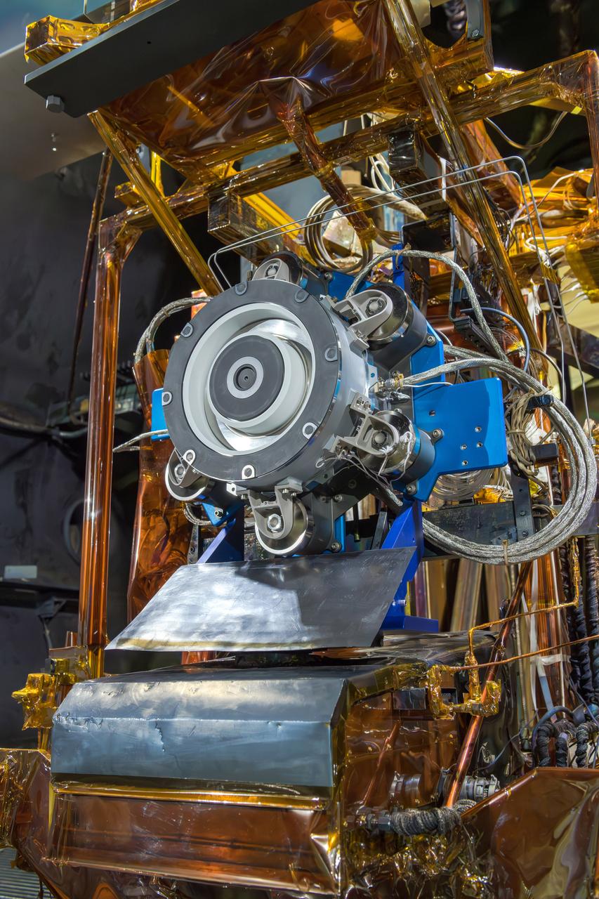NASA astronauts Barry "Butch" Wilmore, from left, Eric Boe and Suni Williams survey an RL10 engine as it stands in a vacuum chamber at Aerojet Rocketdyne's test stand in West Palm Beach, Florida. The engine will be one of two used for the Centaur upper stage during a United Launch Alliance Atlas V mission to launch Boeing's CST-100 Starliner on a flight test carrying a crew. The engine was test-fired as part of acceptance testing to confirm the engine is ready for flight.