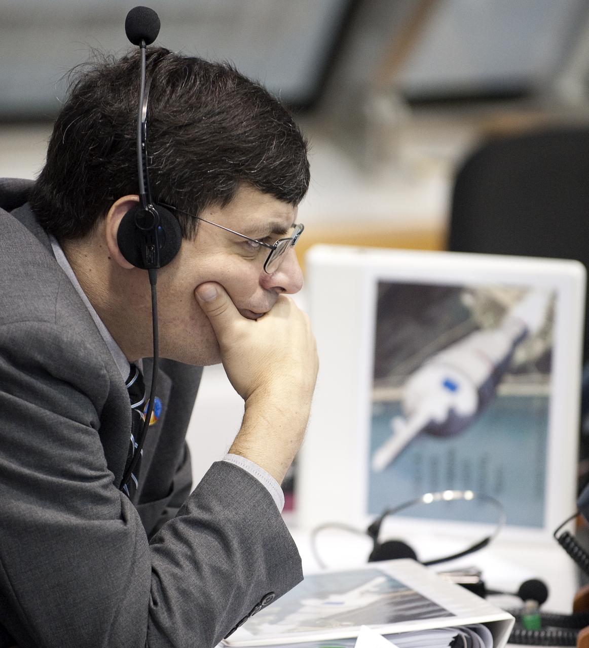 NASA Ares I-X Launch Director Ed Mango monitors the launch countdown from Firing Room One of the Launch Control Center (LCC) at the Kennedy Space Center during the planned launch of the Ares I-X rocket from pad 39b at the Kennedy Space Center in Cape Canaveral, Fla., Tuesday, Oct. 27, 2009. The flight test of Ares I-X will provide NASA with an early opportunity to test and prove flight characteristics, hardware, facilities and ground operations associated with the Ares I. Photo Credit: (NASA/Bill Ingalls)