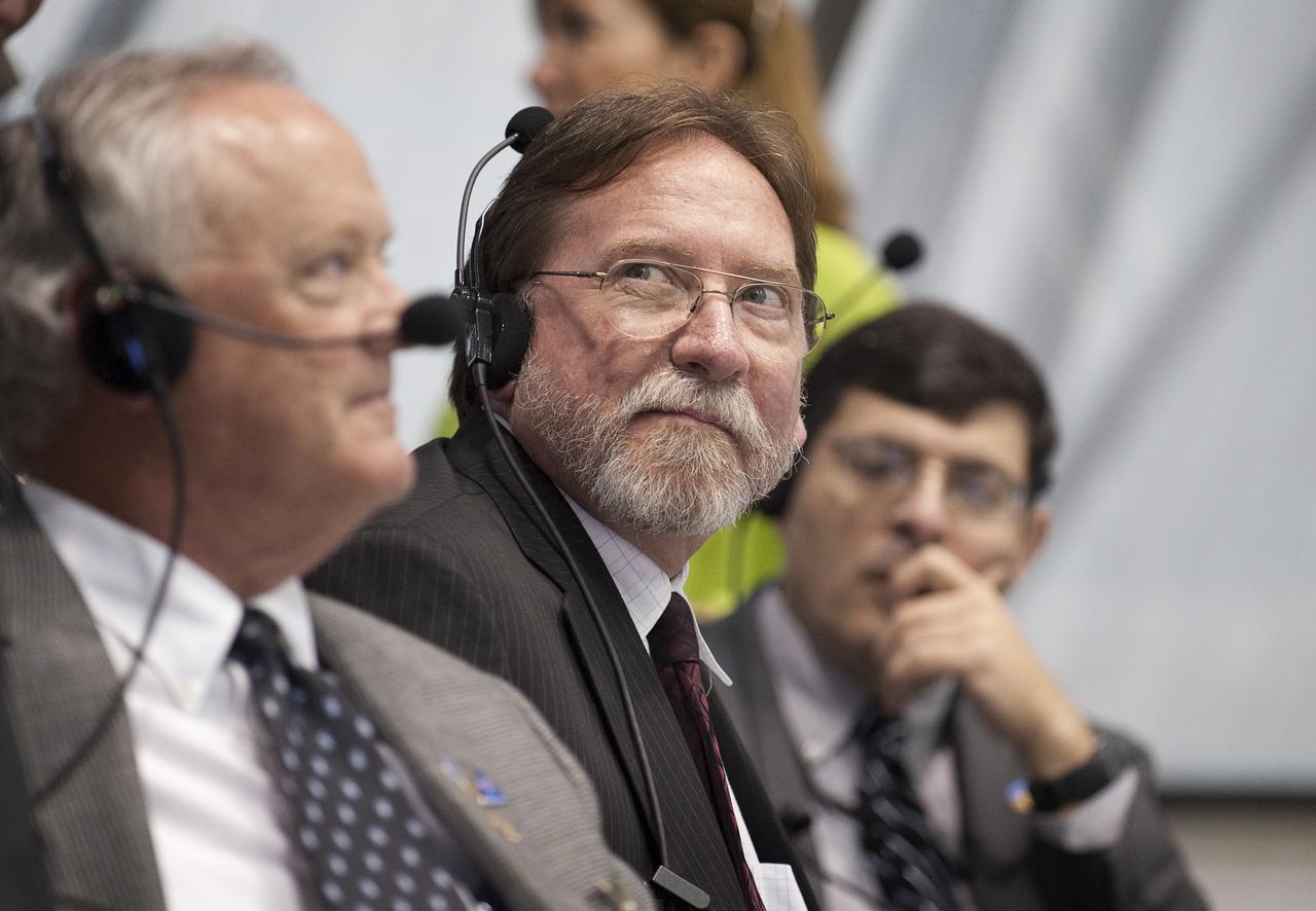 Mission managers, from left, NASA Constellation Program manager Jeff Hanley, Ares I-X Launch Director Ed Mango, Ares I-X mission manager Bob Ess, Ground Operations Manager Philip "Pepper" Phillips, review the latest data in Firing Room One of the Launch Control Center (LCC) at the Kennedy Space Center during the launch countdown of the Ares I-X rocket in Cape Canaveral, Fla., Tuesday, Oct. 27, 2009. The flight test of Ares I-X will provide NASA with an early opportunity to test and prove flight characteristics, hardware, facilities and ground operations associated with the Ares I. Photo Credit: (NASA/Bill Ingalls)
