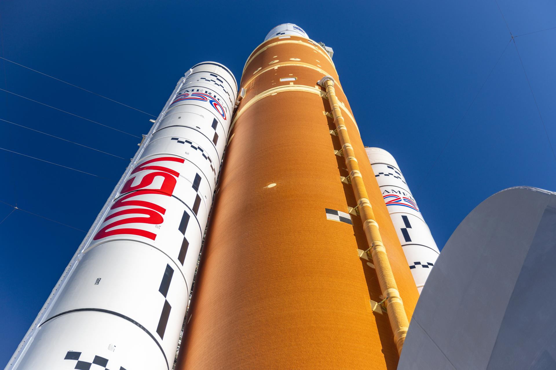 In this angle looking up, this photograph shows NASA’s Artemis II SLS (Space Launch System) rocket and Orion spacecraft, secured to the mobile launcher at Launch Complex 39B at NASA’s Kennedy Space Center in Florida on Tuesday, Jan. 20, 2026. The Artemis II test flight will take Commander Reid Wiseman, Pilot Victor Glover, and Mission Specialist Christina Koch from NASA, and Mission Specialist Jeremy Hansen from the CSA (Canadian Space Agency), on a 10-day journey no earlier than 6:24 p.m. EDT on Wednesday, April 1.