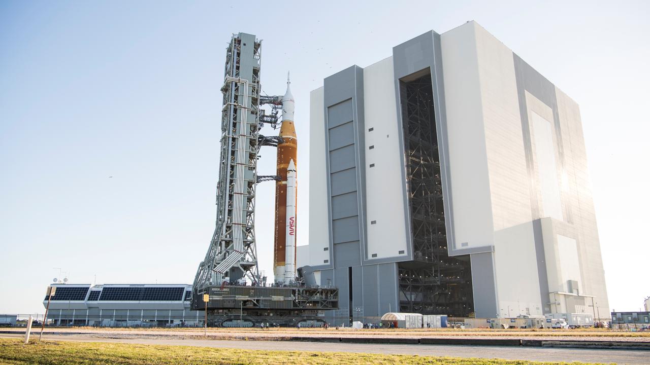 Space Launch System (SLS) rocket and Orion Spacecraft rollout at Kennedy Space Center
