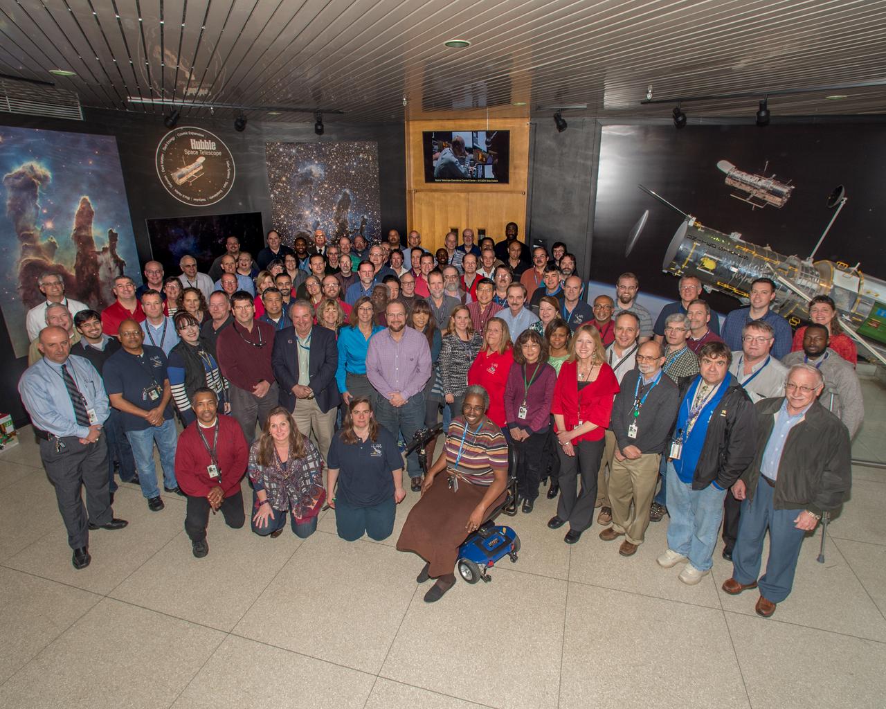 Ocean Color Instrument (OCI) team members pose with the flight hardware after successful instrument integration to the Tilt mechanism. OCI is a highly advanced optical spectrometer that will be used to measure properties of light over portions of the electromagnetic spectrum. It will enable continuous measurement of light at finer wavelength resolution than previous NASA satellite sensors, extending key system ocean color data records for climate studies. OCI is PACE's (Plankton, Aerosol, Cloud, ocean Ecosystem) primary sensor built at Goddard Space Flight Center in Greenbelt, MD.